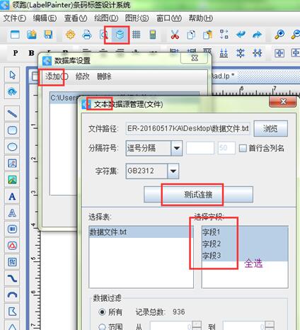 套標的標簽排版在上篇文章中有介紹,這里不再詳述,就是將一組套標當成一個大標簽來設置。設置好標簽紙張排版后,點擊條碼打印軟件左上角的“數據庫設置”按鈕,點“添加”-“txt”文本數據源(文件),彈出的數據源管理窗口中哦,通過“瀏覽”按鈕引入數據文件,并點“測試連接”引入數據。完成后關閉窗口。之后就可以添加標簽內容了。