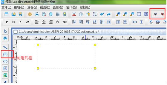 為了方便準確的定位大標簽的位置和尺寸,可以使用矩形框代替大標簽紙。先會繪制一個矩形框,尺寸與大標簽尺寸一樣,放置位置跟實際紙張上的位置一樣。因為實際打印中,不需要將矩形框打印出來,可以將矩形框設置為不可見(在條碼生成器頂部工具欄中有2個眼睛的圖標,一個是可見,一個是不可見,選擇“不可見”) 。可以根據自己的需求在大標簽上添加要打印的信息。