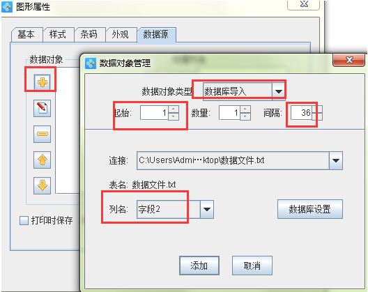 最后選擇“數據源“選項卡,點擊數據對象下的刪除按鈕,刪除默認對象。再點“十字添加”按鈕,彈出“數據對象管理”窗口,選擇對象類型為“數據庫導入”。注意修改“起始”和“間隔”。