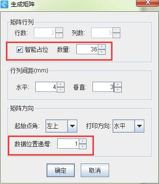 在“生成矩陣”的窗口下,勾選“智能占位”,輸入一組套標的小標總量36個。然后設置行間距和垂直間距:就是左右2個標簽間距的行間距,和上下2個標簽之間的垂直距離。根據自己的需求也可以調整起點位置和生成數據排版的方向,這里保存默認的左上,水平方向的設置。