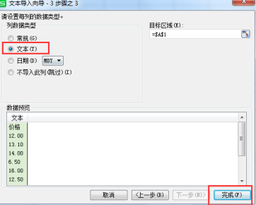 將剛才保存的txt文本數據導入到新的excel表中,根據導入向導提示選擇適合的選項(前面的幾步保持默認設置即可),注意最后一步要選擇“文本”數據類型。