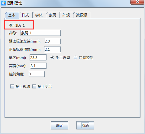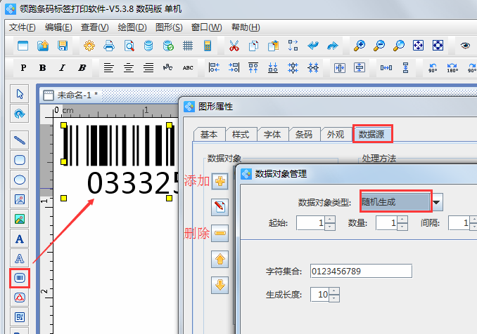 以二維碼引用條形碼的數據為例,首先需要先有條形碼,在畫布中繪制一個條形碼后,雙擊條碼進入屬性窗口,如下圖,記住條碼的圖形ID,在數據源選項中,先刪除默認數據對象后,然后添加新的數據對象,設置條形碼的數據為隨機生成。
