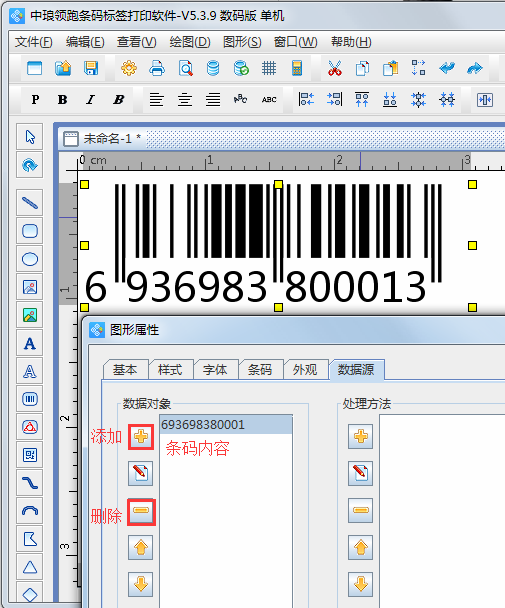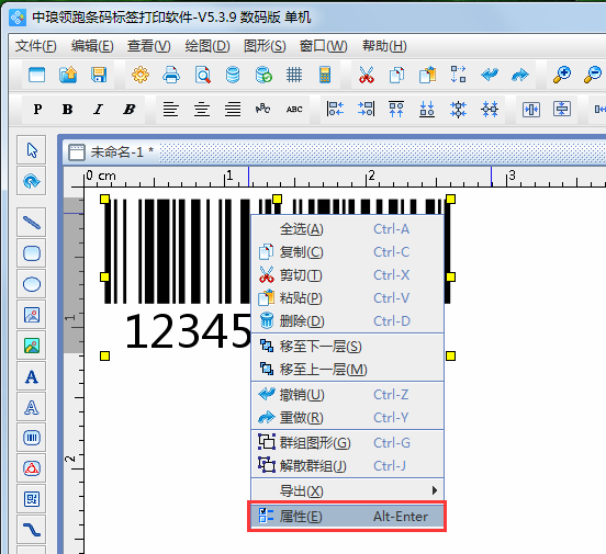以常見的EAN-13條碼為例,在中瑯條碼標簽打印軟件中,點擊左側工具欄中的“繪制一維條碼”按鈕,在畫布空白區域拖動鼠標繪制出一個條形碼模板,然后在條形碼上點擊鼠標右鍵選擇“屬性”,進入屬性窗口。