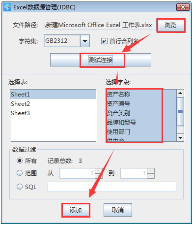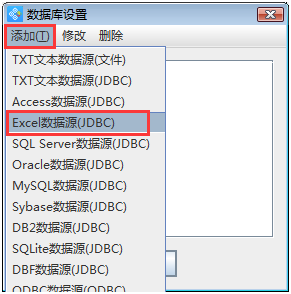 選擇軟件上方菜單欄中的“數據庫設置”按鈕,在彈出的窗口中,點擊“添加”—“Excel數據源”,在新彈出的數據源管理窗口中點擊“瀏覽”按鈕,找到數據庫所在的文件位置并打開,然后點擊“測試連接”,待下方“選擇表”和“選擇”字段欄內顯示數據庫內容時,表示數據庫導入成功,此時點擊“添加”按鈕即可。