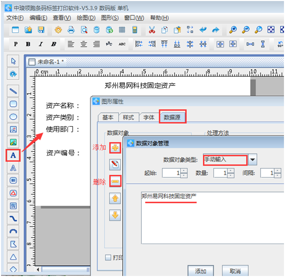 利用軟件左側工具欄的“繪制普通文本”工具,在畫布空白區域按次繪制出各個普通文本。雙擊文本進入“屬性”窗口,可以修改相應的圖形屬性,在“數據源”選項中,先點擊左側數據對象欄中的減號按鈕,刪除默認數據對象,然后再點擊加號按鈕,添加新的數據對象,數據對象類型為“手動輸入”,在輸入框中添加固定不變的文本信息。