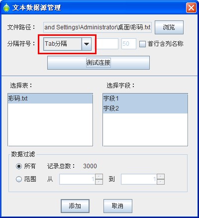 在彈出的文本數據源管理器中,通過瀏覽將彩碼txt文本導入,然后在分隔符號,選項中,選擇除了逗號以外的其他分隔符號。這里我們用Tab分隔。這一點十分重要,因為彩色防偽碼外部導入時所用的格式就是用逗號分開的。為了保證導入的數據庫的格式的完整性,這里我們不用逗號分隔,有除此之外的其他分隔符。然后點擊測試連接,確認,完成導入。