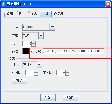 2、在繪制好的普通文本上右擊選擇屬性,彈出圖形屬性窗口,然后選擇字體選項卡,勾選“彩碼”復選框。在彩碼選項后面是需要設定的顏色代碼。也就是說在我們設定在顏色碼中,0-9個數字分別代表什么顏色。中瑯標簽條碼打印軟件的顏色代碼中,從左往右按順序依次排列,每個顏色代碼代表一位顏色碼,顏色代碼直接用半角的逗號隔開。這里我們將顏色集合設置成如下顏色: