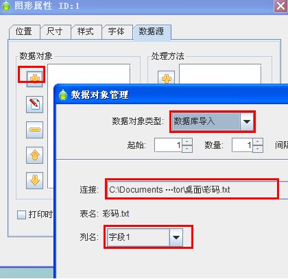 選擇黃色十字添加按鈕,然后在彈出的數據對象界面中,選擇數據庫導入。根據參數提示選擇要調用的彩碼文本及字段。確認后就可以在條碼打印軟件中得到如下圖所示的彩碼。