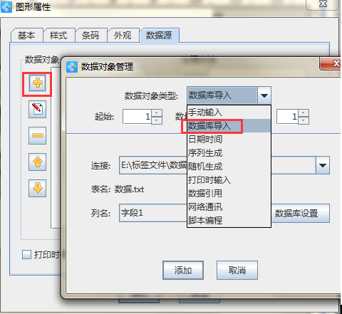 將數據引入中瑯條碼標簽打印軟件后,點擊左側的“繪制二維碼”圖標按鈕,添加二維碼對象。然后在二維碼上右擊-屬性(或雙擊),彈出“圖形屬性”窗口,選擇“數據源”。在“數據對象”欄中刪除默認數據后,點十字添加按鈕,選擇“數據庫導入”引用數據庫中農藥二維碼的內容。