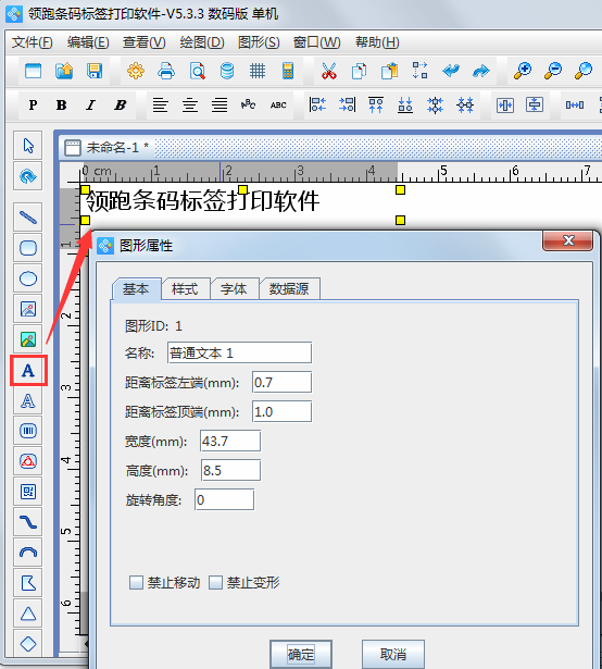 首先在中瑯條碼標簽打印軟件中選擇左側工具欄中的“繪制普通文本”按鈕,在畫布中繪制一個文本框,雙擊(或鼠標右擊選擇“屬性”)文本框進入“屬性”窗口,在“基本”選項中,可以對文本框在畫布中的具體位置及文本框的具體尺寸進行調整,這些基本操作在這里就不一一介紹了。