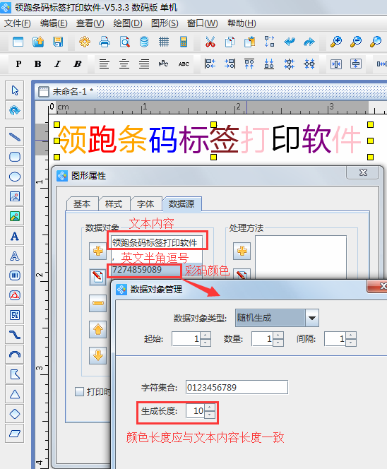 選擇“字體”選項,普通用戶使用最多的就是字體樣式、大小和顏色這些,最重要的是可以設置彩碼,所謂彩碼就是對文本框中的部分或全部文字進行單獨變色,每個文字信息顏色各不相同,要生成彩碼必須在“字體”選項中勾選“彩碼”,彩碼在“數據源”選項中的格式為:文本內容,(英文半角逗號)文本顏色,比如文本內容為10個漢字,要全部設置為彩碼的話數據源選項中的顏色內容就得為10個數據,這10個數據可以是序列生成,隨機生成,也可以通過數據庫導入,如圖所示,就是通過隨機生成的方式添加的顏色碼。