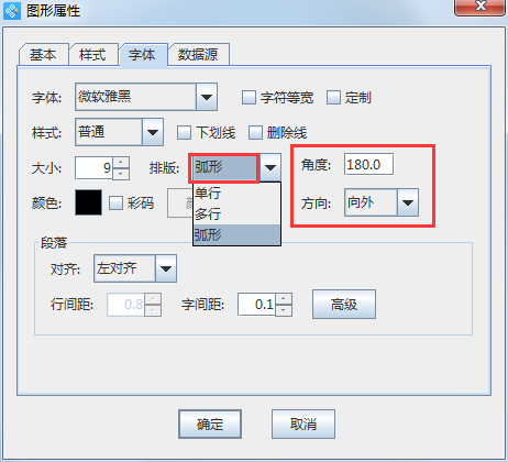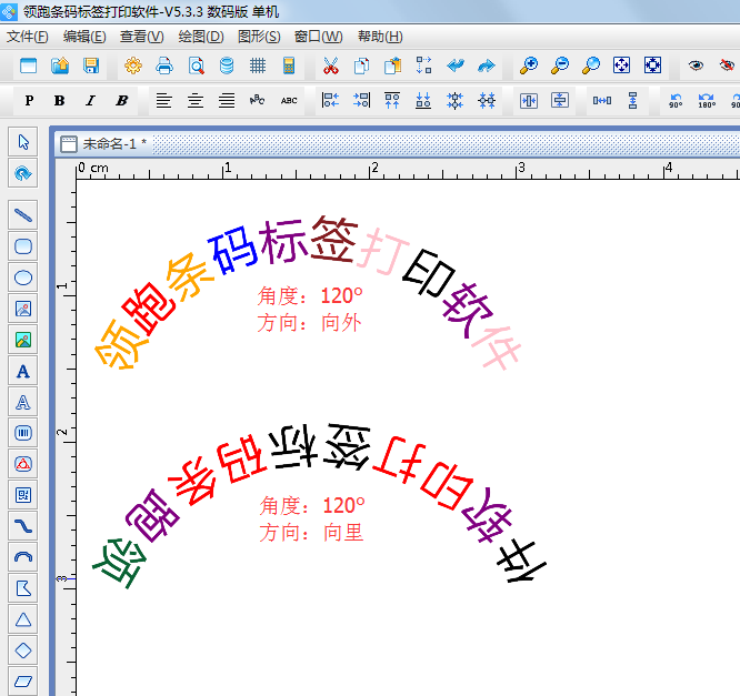 除了普通的文本排列外,中瑯條碼標簽打印軟件還支持弧形文字排版,只需要在排版選項中選擇“弧形”就可以了,選擇弧形后會自動顯示“角度”和“方向”兩個選項,可以調整弧形文字的角度及方向,如圖所示,就是經調整的弧形文字。
