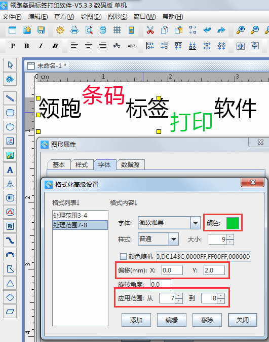 除了可以對文本的字間距和行間距進行設置外,在“段落”欄內的“高級”選項中,還可以對文本內容進行高級處理。如圖所示,就是對文本內容的3-4號文本進行Y軸偏移-2mm,顏色選為紅色;對7-8號文本進行Y軸偏移2mm,顏色選為綠色的處理結果。