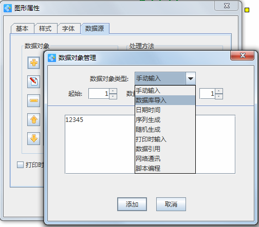當然,文本工具的最強大之處莫過于數據源選項了,在數據源選項中,可以對文本內容進行各種類型的插入,目前支持的數據對象類型就有數據庫導入、序列生成、隨機生成等。