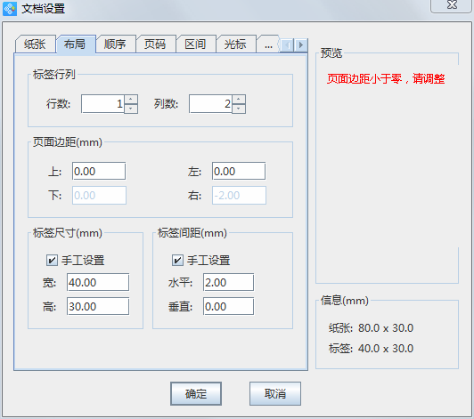 通常預覽不正常是因為軟件中的設置不正確造成的,需要注意的是,新建標簽時,“布局”里面的標簽設置不能超出設置的紙張尺寸,如果超出軟件設置的紙張尺寸就會在右側預覽框內顯示“標簽間距小于零,請調整”的提示,自然就會出現不能打印的情況。如圖,右下角信息欄中標簽尺寸與標簽行列、標簽間距的設置造成整個標簽的尺寸大于紙張尺寸,才會出現預覽不正常的現象,只需要將紙張尺寸設置成對應大小的尺寸就可以了。